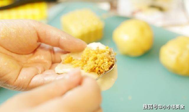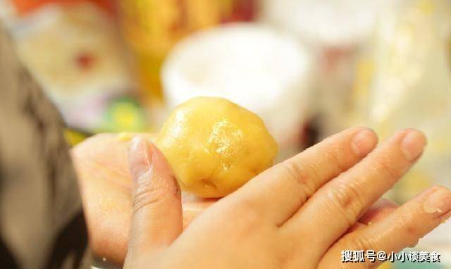4.用蛋黃和肉絲把白蓮蓉包起來揉成球,約。總共35克最好。白蓮蓉可以用他買的東西。或用蓮子、糖、玉米油按3:1:1的比例炒制。
