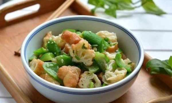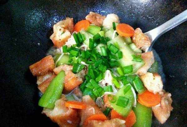炒絲瓜的時候可以加適量的水。如果絲瓜是烤的,它可以煮得更快更軟。絲瓜烘烤後,加入適量的鹽調味,再加入一些蠔油或雞精提味。然後加入油條和辣椒小米,快速翻炒均勻,出鍋前撒上蔥花。