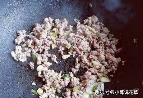 第四步,將炸好的茄子從油鍋中取出,查油,將蔥、薑、蒜洗凈切片,炒鍋中加入少許油,放入蔥、薑、蒜翻炒。炒出香味後加入醃制好的肉末;