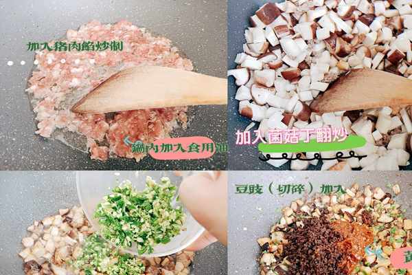 ●●鍋內加入食用油下入豬肉末炒到變色,加入菌菇翻炒到汁水收幹,體積縮小原來的一半,加入蒜蓉和辣椒碎翻炒均勻,加入黃豆醬和豆豉繼續翻炒。
