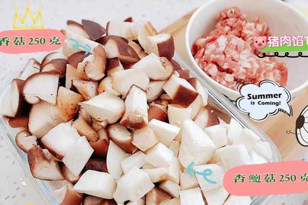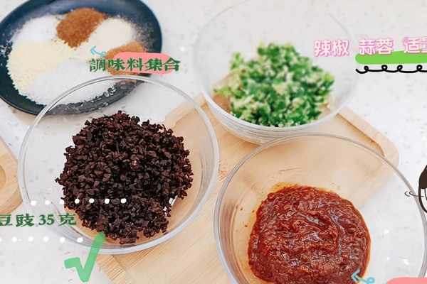 (香菇250克、杏鮑菇250克、黃豆醬65g、豆豉35克、豬肉餡100克、調味料用量如圖所示、食用油80克、生抽30克、老抽10克、線辣椒和蒜適量、飲用水適量、白芝麻適量)?