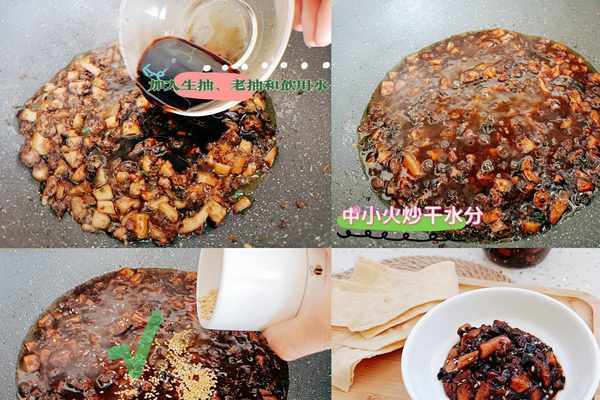 ●●●最後加入所有的調味料、生抽、老抽和食用水,中小火炒幹水分,油脂覆蓋在表面就可以關火瞭,出鍋前撒上熟的白芝麻翻炒均勻就可以出鍋瞭!