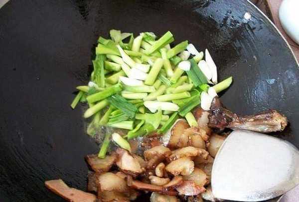 第四步:所有的材料都處理好之後,就可以開始燒鍋瞭。首先,用大火加熱鍋。鍋燒熱後,將臘肉直接放入鍋中,用油煎一下,這樣才不會油膩。培根炒至出油後,加入切碎的辣椒和薑片,翻炒均勻,拌勻後加入切碎的蒜頭,小火翻炒至蒜頭變軟!
