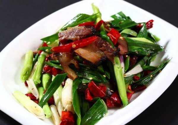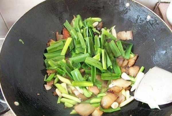 第二步:培根煮熟後,取出用冷水沖洗幹凈,然後將培根切成薄片備用。將準備好的蒜苗用清水沖洗幹凈。洗的時候把蒜苗的黃葉去掉,這樣蒜苗吃起來會更軟!