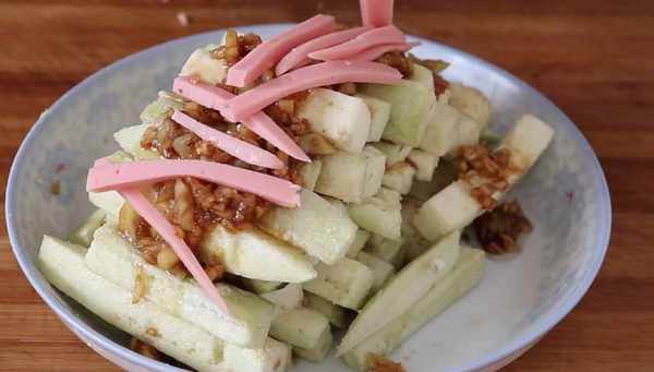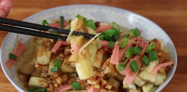 【制作食材】長茄子,大蒜,食用油,香醋,生抽,食用鹽,白糖,淀粉,火腿腸,生薑,小蔥