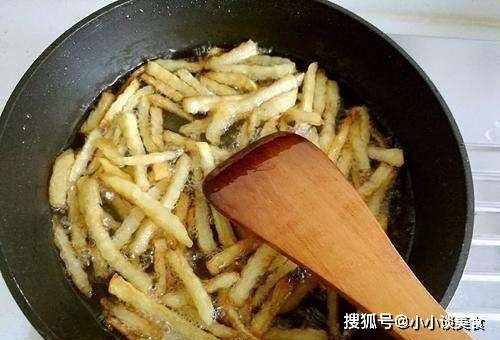 在鍋中加入足夠的食用油,然後加熱油。當油大約70%熱時,你可以把土豆放進去炸。炸土豆的時候註意不要沾水,否則容易濺油燙皮。將土豆放入鍋中煎至浮起或變軟變脆。你可以用抹刀輕輕按壓它們使其變軟,然後將它們取出。取出後,重新加熱鍋中的油,將油加熱至油溫的80%,快冒煙時,放入土豆炒約30分鐘。炸薯條需要15秒到半分鐘。
