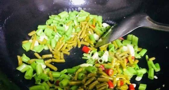 3:然後加入少許料酒、醬油、醋和冰糖繼續炒。快熟的時候,加少許鹽,翻炒幾分鐘。