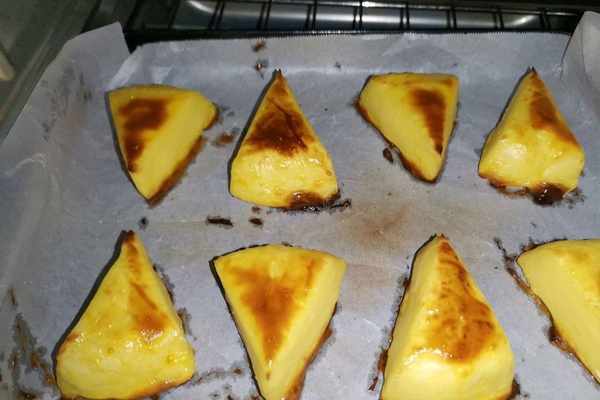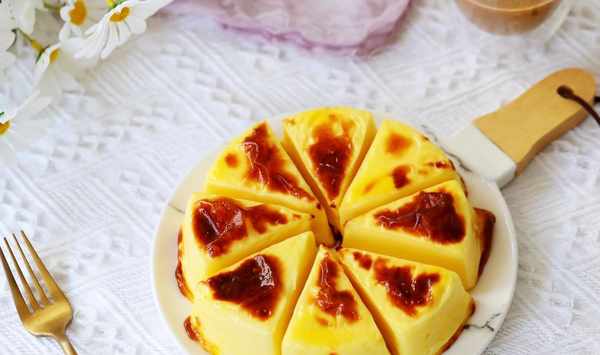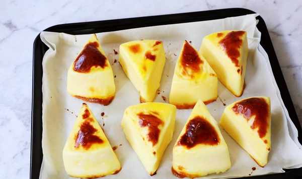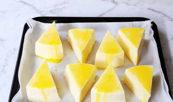 5、待鮮奶糊凝固之後,取出倒扣脫模,切成幾個小塊,也可以不切,一整個也是可以的。然後在表面刷上一層全蛋液,烤箱提前200度預熱。