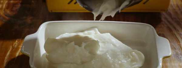 4、熬好的鮮奶糊要馬上倒入模具中,表面可以用鏟子鋪平,也可以抖動模具,然後待其放涼凝固。若是要節省時間,也可以放進冰箱中。