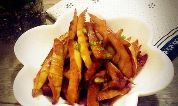 春筍泡好後撈出瀝幹水分待用。鍋內倒入適量食用油,然後放入五花肉翻炒五花肉,加入薑蒜爆香。然後我們把春筍放進去炒,把春筍滾上肥油,在油裡慢慢煮。然後加入適量的水,少許醬油,大火燜煮片刻。待汁快收幹時,加入少許鹽,翻炒均勻。上菜前撒上蔥花。