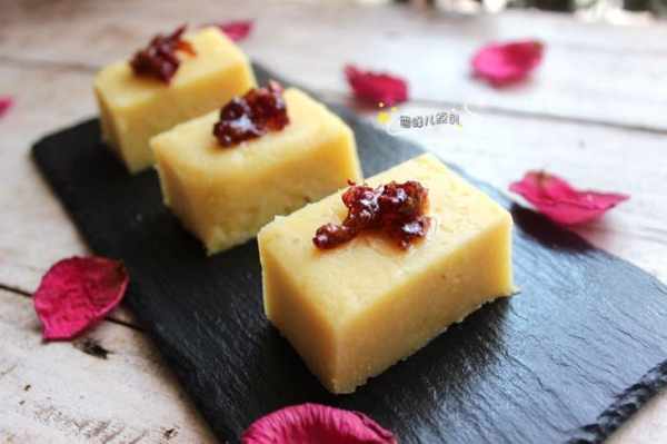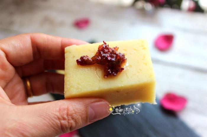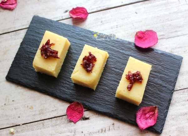 吃得時候拿出,切塊,點綴上一些玫瑰醬,玫瑰醬的多少可以隨意,如果老年人吃,可以少一點,如果孩子或者年輕人吃就可以多一點,玫瑰醬對於女生的好處更多,養顏補血,臉色更好,和綠豆糕特別的搭配,清香好吃。