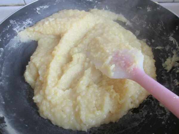 把蒸制好的綠豆倒入不粘鍋中小火慢慢的炒制,煸炒的時候,用鏟子壓就可以撚的很碎了。