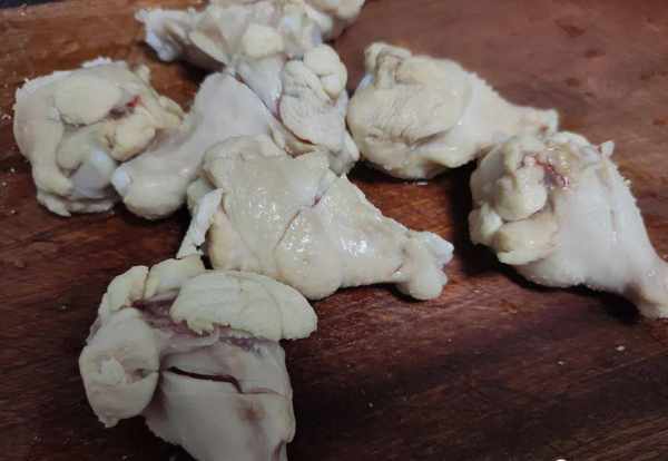 1.雞腿洗凈放在鍋中焯水,撈出放在案板上表面劃兩刀。備好的酸菜跟年糕放著洗凈;