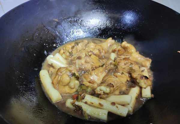 4.鍋裡面的雞腿燜煮瞭10分鐘左右,裡面的水也收得差不多。我們再把酸菜跟年糕放入裡面,下鍋之後用鏟子給它們炒均勻,然後蓋上蓋子再燜煮個三分鐘;