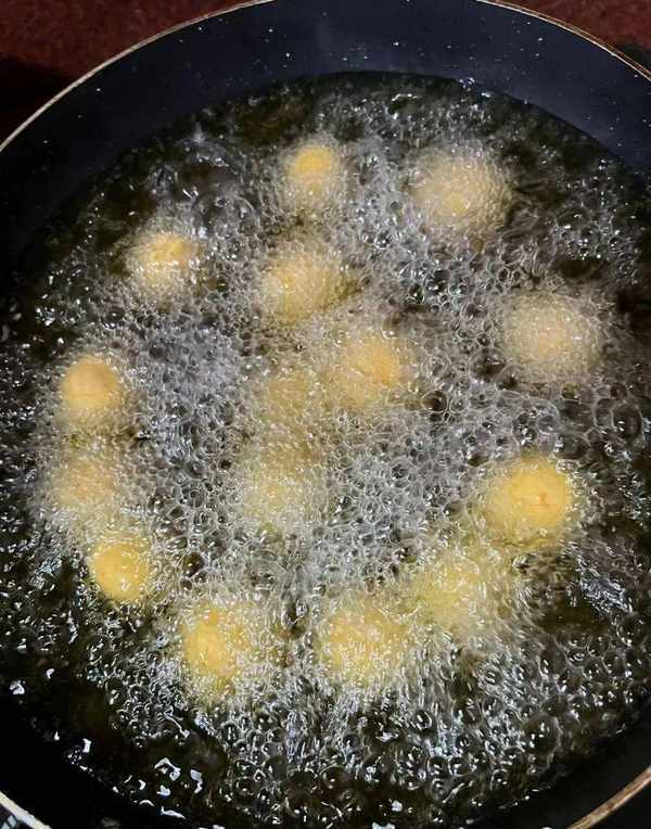 4.鍋中的水分幹後,倒入油。油溫7成熱後,把剛搓好的地瓜丸子放入裡面;
