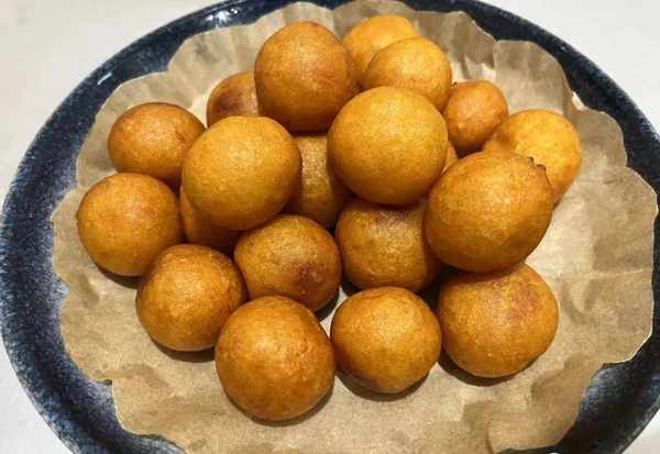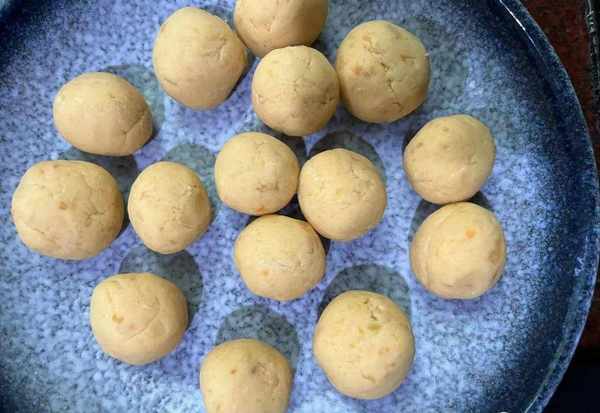 用手取出一小塊的地瓜泥,然後用手給它搓成光滑的圓球狀,搓好後的地瓜丸子放在盆裡面備用。一個個丸子都處理好後,就開始準備油瞭;
