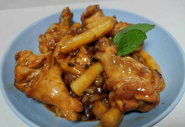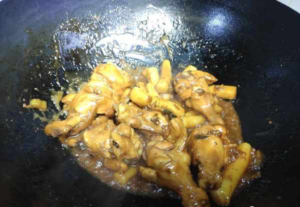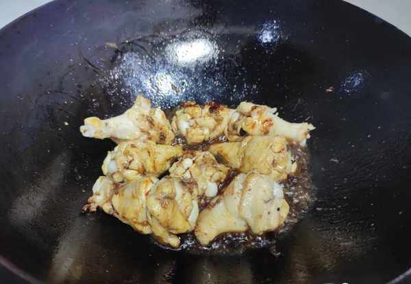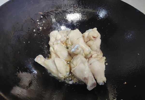 2.備好的生薑洗凈,然後切片放在一旁備用。鍋裡面倒入油,將油燒熱,然後把生薑末放入油鍋中,用小火煸炒,炒出香味。生薑末炒香瞭之後,加入麻油,白糖鏟子將它們炒成糖色,再把雞腿放入裡面;