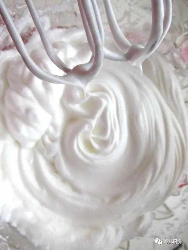 4,白糖分三次加入到蛋清裡打發成幹性發泡的蛋白霜。