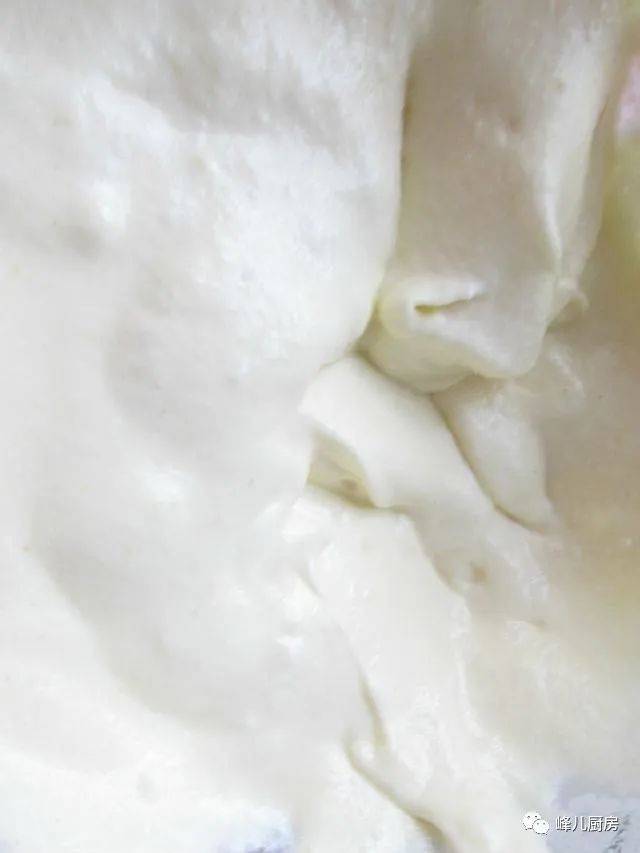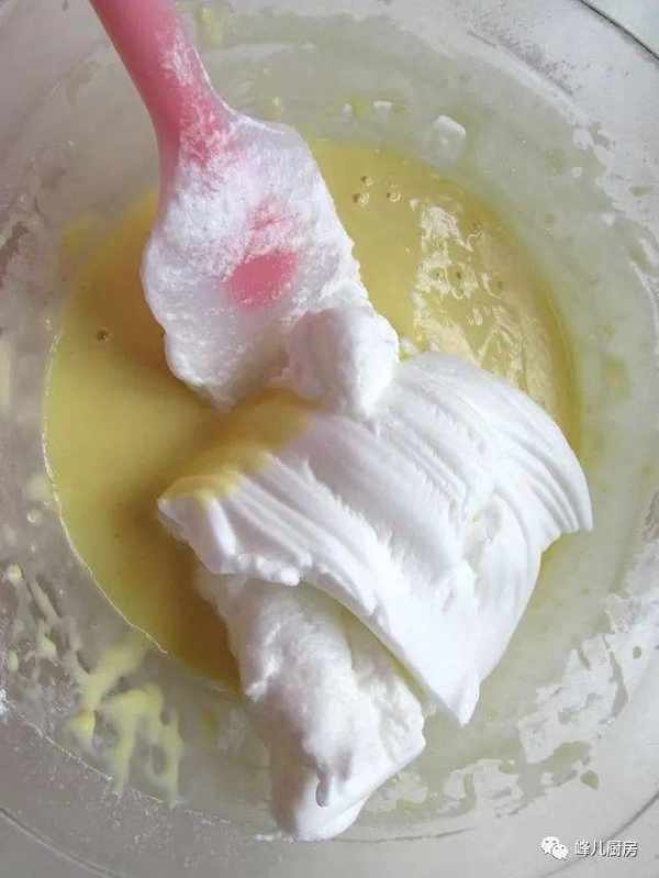 2、蛋白霜加入到蛋黃糊中時一定要上下翻拌,以免蛋糊起筋,影響蛋糕的蓬起度。