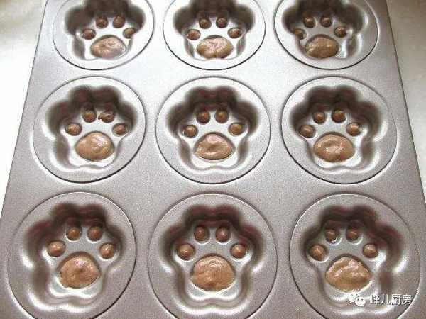 8,用裱花袋把巧克力蛋糕糊擠到貓爪模具的小坑裡。