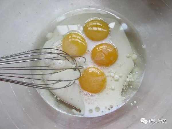 2,把蛋黃裡加入葵花籽油,牛奶拌勻。