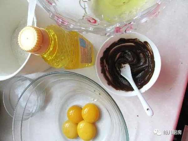材料:雞蛋4個,底筋面粉80克,葵花籽油40克,牛奶80克,白糖50克,巧克力