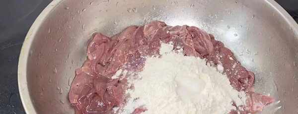 下一步給豬肝進行第二步的處理,加入一把面粉,加入兩勺鹽,加入小半瓶啤酒,然後用左手給它抓拌,這個過程在兩分鐘以上,然後放著給它醃制五分鐘左右。