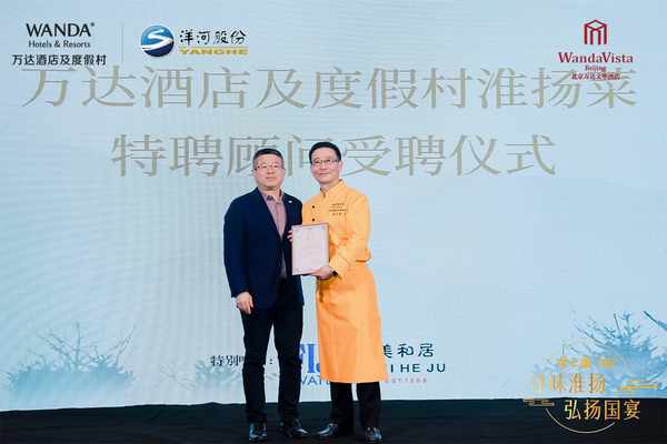 在晚宴上,董軍代表萬達酒店及度假村向淮揚菜大師蔣應榮頒發“萬達酒店及度假村淮揚菜特聘顧問” 聘書。2023年,淮揚菜大師蔣應榮會繼續以特聘顧問的身份,帶領北京萬達文華酒店廚師團隊進行“尋味淮揚 弘揚國宴”活動推廣。