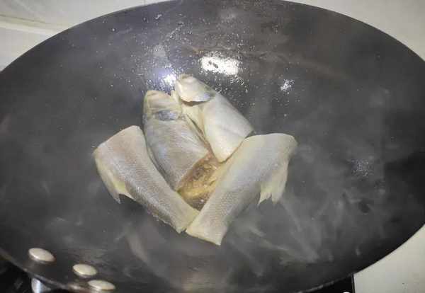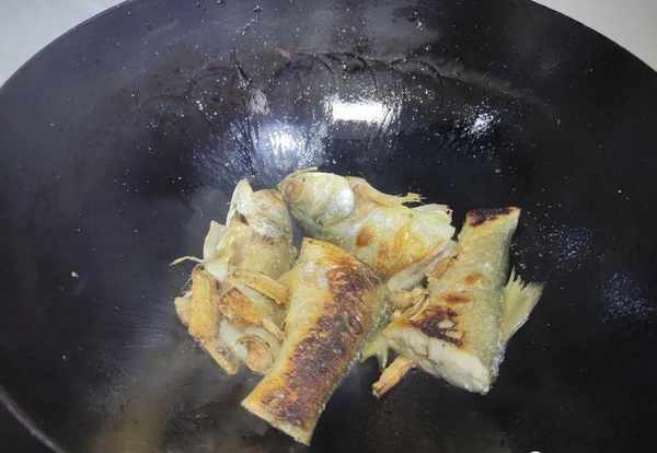 3.魚肉下鍋之後不要動它,用小火慢慢煎煮。將鍋裡面的魚肉煎成表面微微焦黃後,翻另外一個面。直到把魚肉的兩面都是金黃色的,之後我們加入適量的食鹽跟醬油,然後倒入水;