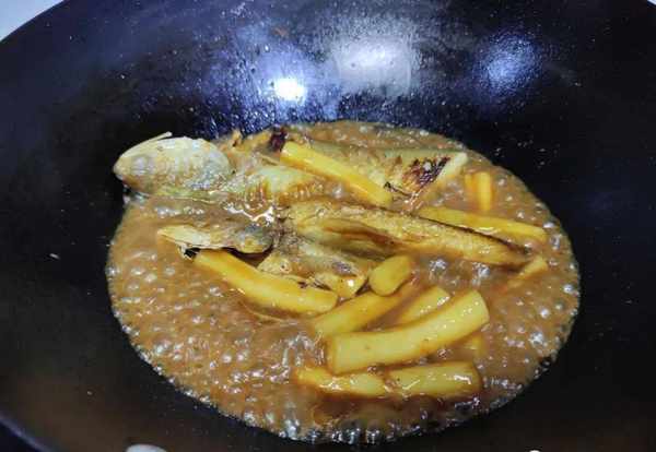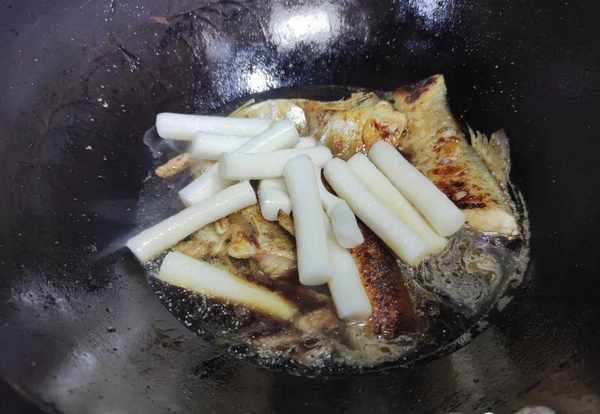 2.魚要先下鍋煎煮,煎至金黃然後燜煮。讓年糕吸收魚的湯汁,出鍋後又鮮又好吃。