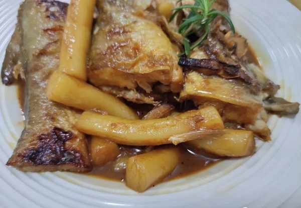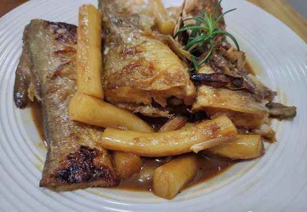 很快,這樣子一份美味營養的魚燜年糕就這樣子完成,這樣做出來的年糕口感而有嚼勁,吸收瞭魚汁裡面的味道。魚肉口感都細膩,醬油燜煮後的味道鮮,兩種食材放在一起特別好吃。