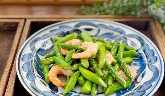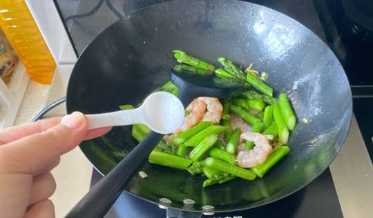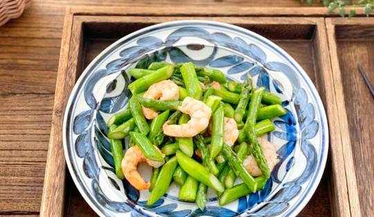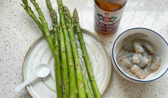 蘆筍300克,蝦仁8個,黑胡椒粉1勺,鹽2克,蔥花少量,料酒10克,薑絲少量,植物油3勺。