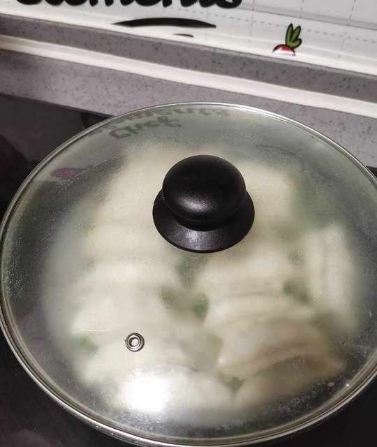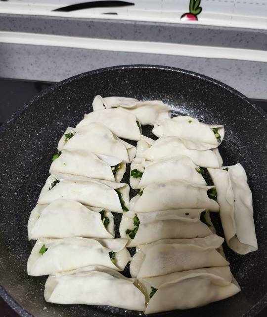 14.平底鍋倒點油,熱鍋,依次放入鍋貼。