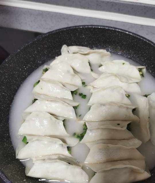 16.倒入平底鍋裡,沒過鍋貼1/2位置。