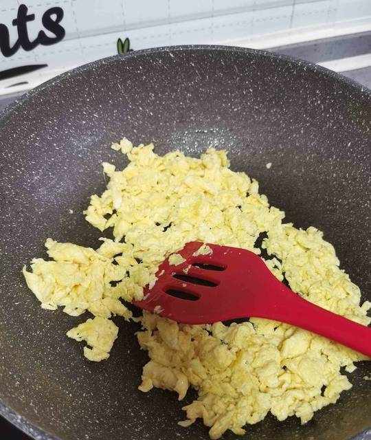 4.雞蛋炒熟,搗碎盛出備用。