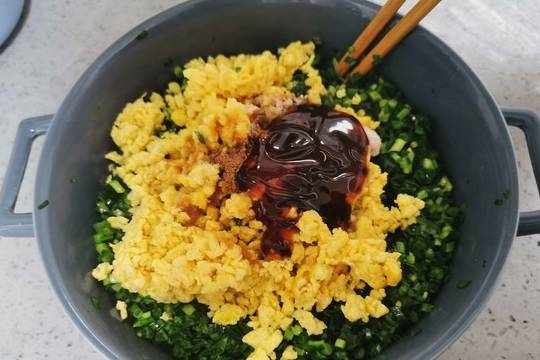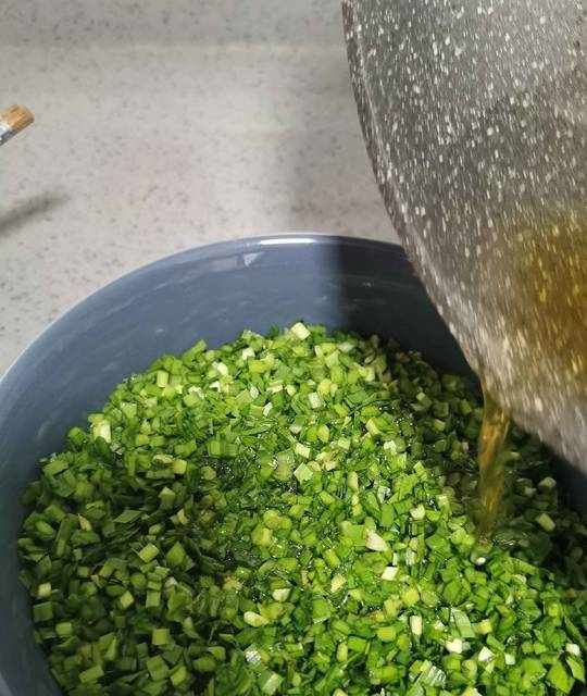5.韭菜裡先加入一湯勺菜籽油,攪拌均勻,以免放鹽後出水嚴重。