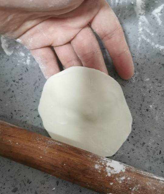 10.搟成餃子皮大小薄厚。這個時候要多使點幹面粉,防粘。