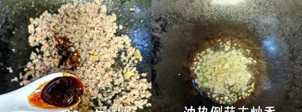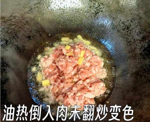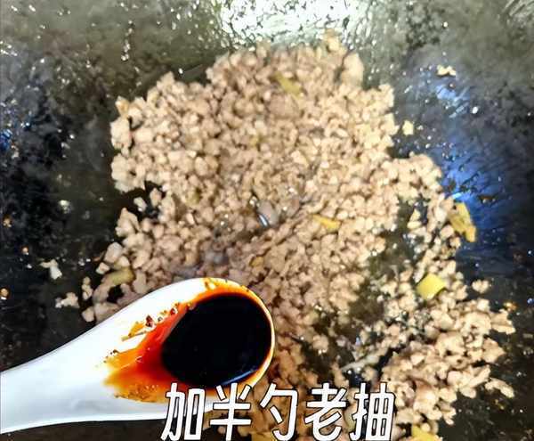 步驟4:鍋中燒熱加上冷油,等待油溫變成溫熱,倒入肉末煸炒成變色,加上半勺老抽調色,加上一勺蠔油,迅速翻炒片刻,裝盤備用。