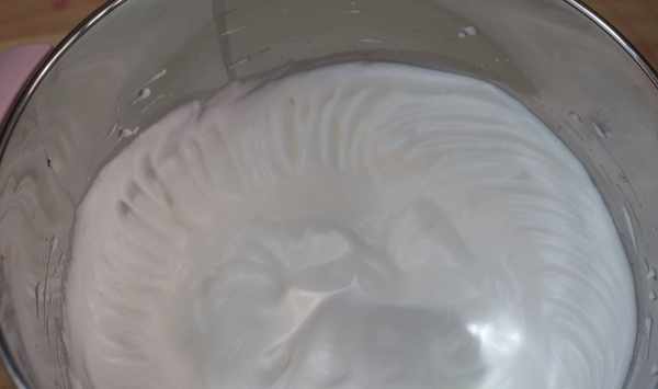 5、將蛋清取出,加入幾滴白醋,分3次加入細砂糖,將蛋清打發至可以拉出大彎鉤的狀態。
