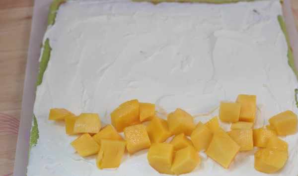 11、將淡奶油抹到蛋糕片上,一端擺上芒果。