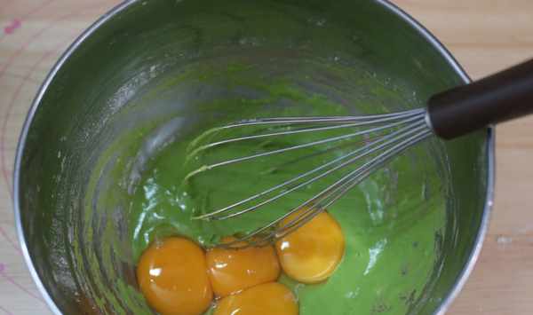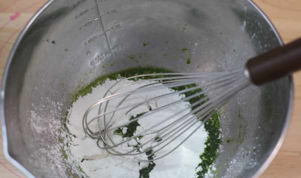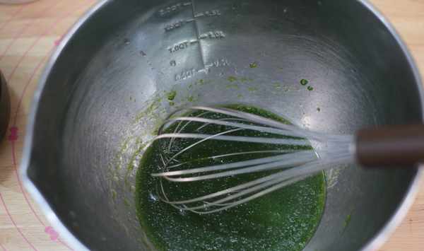 2、將菠菜汁和玉米油倒入打蛋盆中,用手動打蛋器攪拌均勻。