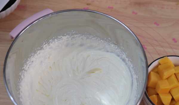 10、淡奶油加入細砂糖,用電動打蛋器打至有清晰紋路的狀態。芒果切成小塊。