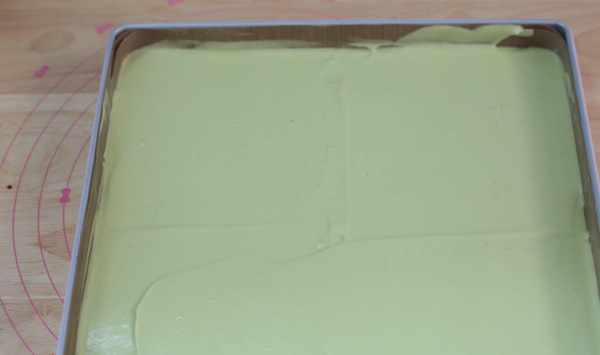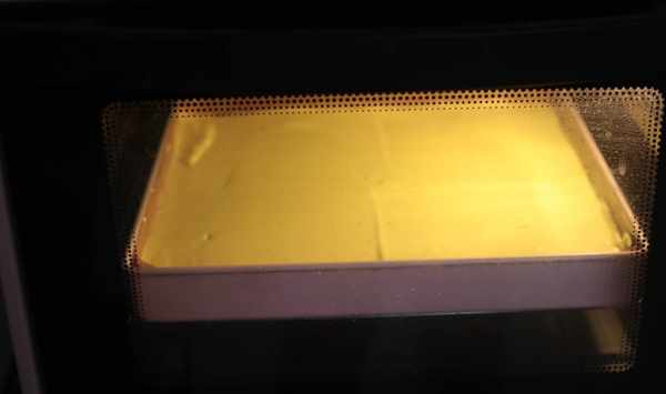 8、將面糊重高處倒入學廚28*28的烤盤中,稍微刮平表面,輕震出大氣泡。