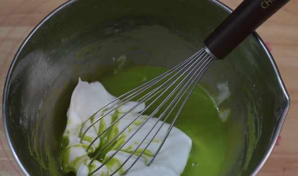 7、把攪拌好的面糊重新倒回蛋白霜中,繼續用切拌的手法,攪拌均勻。