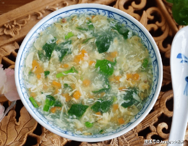 接著放入菠菜攪拌均勻,再加入鹽、雞精調味,這道菜就做好瞭,清淡不膩,吃起來很舒服。