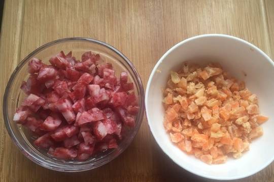 3.香腸和開洋溫水泡一下,然後洗凈切丁備用