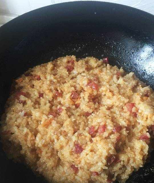 5.倒入蒸好的糯米、生抽、蠔油一起翻炒,帶顏色均勻且糯米炒熟離火冷卻