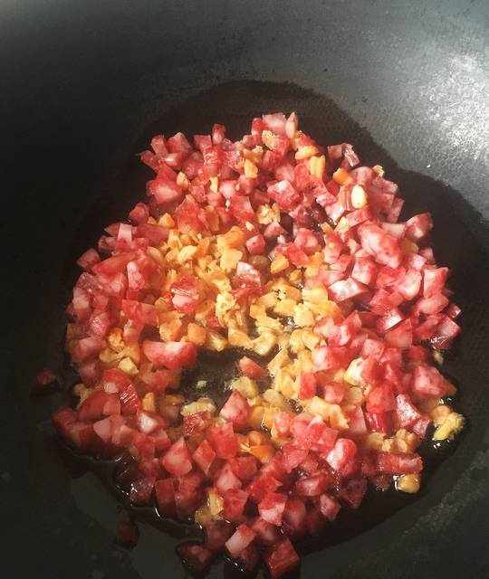 4.起油鍋倒入香腸和開洋,煸炒幾下加入料酒
