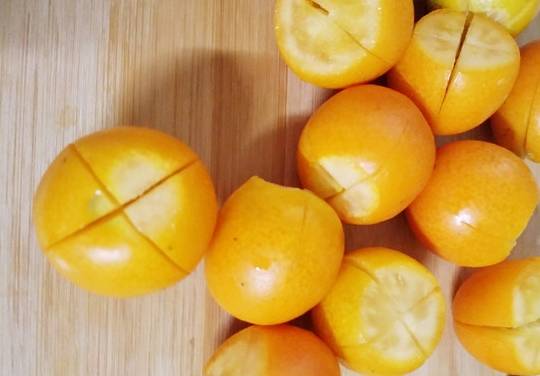 首先我們要把金桔用鹽水清洗幹凈,我是用鹽直接搓洗,在放到清水中,我覺得這樣會清洗得更幹凈,要是小夥伴嫌麻煩可以選擇用鹽水的,清洗好之後去蒂,再給金桔橫豎切一道,這樣在熬煮的時候,會更加的入味。