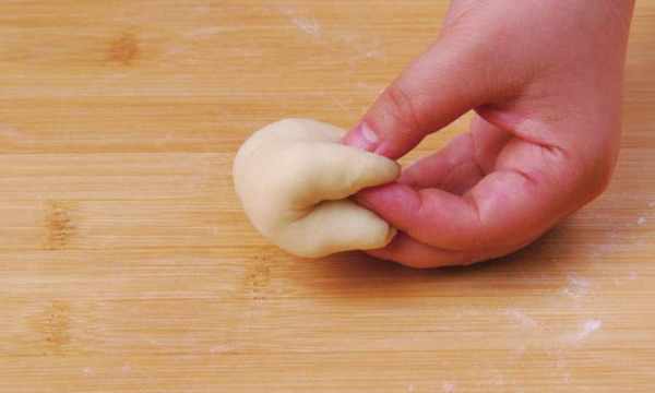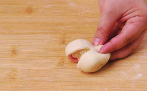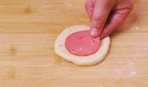 做法1.將除黃油以外的所有面包體用料混合均勻,揉至表面光滑,再加入黃油揉至擴展階段,放在溫暖處發酵約1個小時,至原來的兩倍大,將發酵好的面團揉勻後,平均分成8份,繼續餳發15分鐘備用。2.取一小面團,搟成小圓形,翻面後放上一片火腿片(圖1),自上而下卷成筒狀,然後將面團從中間對折(圖2)